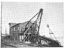 The Reclaiming Sand Dredge was constructed for the Calumet and Hecla Mining Company in 1914 by the Bucyrus Company of South Milwaukee, Wisconsin,[3] and designated the Calumet and Hecla Dredge Number One.[1] The dredge was used to reclaim previously-milled sand deposited in the lake after it had gone through the stamp mill.[4] The dredged sand contained copper that earlier stamping technology had not been able to separate out.[4] Improvements in stamping efficiency and cost increases in traditional shaft mining made these sand tailings economically feasible to reclaim and re-stamp.[4]