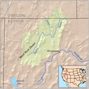 The Quinn River is the largest river in the region, starting in the Santa Rosa Range and ending in the Quinn River Sink on the playa south of the Black Rock Range. The watershed covers 11,600 sq mi (30,000 km2)[1] including the Upper and Lower Quinn River, Smoke Creek Desert, Massacre Lake, and Thousand Creek[3]/Virgin Valley[4] watersheds of northwestern Nevada as well as small parts across the borders of California and Oregon.