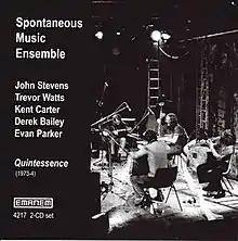 Quintessence is a live album by the Spontaneous Music Ensemble featuring percussionist/cornetist John Stevens saxophonists Trevor Watts and Evan Parker, guitarist Derek Bailey, and bassist Kent Carter which was recorded in 1973 and released on the Emanem label.[1][2][3] The album was first released in two parts on separate LPs entitles Eighty Five Minutes in 1986 then with additional material as two separate CDs entitled Quintessence in 1997 and finally as a single 2-CD set in 2007.