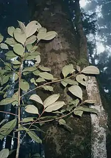 The leaves are alternately arranged along the stem, oval-elliptical to elliptical with a short blunt tip. The hairless and leathery leaves are 5–15 centimetres (2–6 in) long, 1.5–5 centimetres (5⁄8–2 in) wide on mature foliage.[4] The upper surface is dark green, underneath a paler green. The underside of the leaves has tiny colourless glands.[4] The 1–2-centimetre-long (1⁄2–3⁄4 in) leaf stalks are twisted.