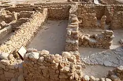 The Hellenistic period settlement was constructed during the reign of Hasmonean leader John Hyrcanus (134–104 BCE) or somewhat later.[2] Qumran was inhabited by a Jewish community of the late Second Temple period, which most scholars identify with the mystic sect of the Essenes; however, other groups were also suggested.[3][4][5] It was occupied most of the time until 68 CE and was destroyed by the Romans during the First Jewish-Roman War, possibly as late as 73 CE. It was later used by Jewish rebels during the Bar Kokhba Revolt.[6] Today, the Qumran site is best known as the settlement nearest to the Qumran Caves where the Dead Sea Scrolls were hidden, caves in the sheer desert cliffs and beneath, in the marl terrace. The principal excavations at Qumran were conducted by Roland de Vaux in the 1950s, and several later digs have been carried out.
