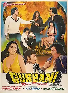 Qurbani (transl. Sacrifice) is a 1980 Indian Hindi-language musical romantic action thriller film produced, directed by and starring Feroz Khan (under the banner of FK International). The film co-stars Vinod Khanna, Zeenat Aman, Amjad Khan, Shakti Kapoor, Aruna Irani, Amrish Puri and Kader Khan.[3] Qurbani was famous for its music, especially the Bollywood disco song "Aap Jaisa Koi" sung by Pakistani popstar Nazia Hassan and produced by Biddu, as well as the song "Laila O Laila".