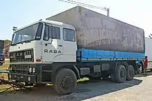 1980 DAF 241 cabs appear on trucks. Rába's trucks originally used cabins supplied by West German MAN, but from 1980 on DAF's F241 cabin was used.[4] A few Roman cabs (of MAN origins) were also supplied from Romania in return for engines.[5] Rába's engine mainstay was itself of MAN origins, with the old D21 inline-six diesel massaged up to 300 PS (221 kW) with the help of turbocharging and intercooling.[4]