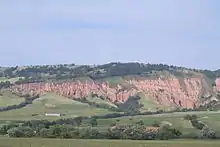 Râpa Roșie is a geological reserve and a natural monument with unusual red bed features. Assessing the geological age of the formations has been a daunting task as no fossil remains had been found in the past.[4][5]
