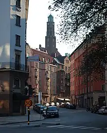Rådmansgatan in a northeasterly direction as seen from Birger Jarlsgatan. The Engelbrekt Church is visible in the background.