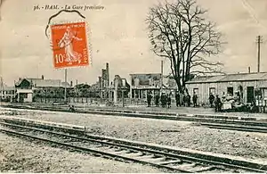 - Ham – 78 kilometres (48.47 mi) from Albert. Elevation 64 metres (210 ft). Shared with station on standard gauge Amiens-Tergnier line. Junction with metre gauge line to Noyon.[19] A sucrerie at Eppeville, near Ham, was served by the addition of a metre gauge siding to the existing standard gauge one.[13]