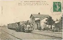 The 20-kilometre (12 mi) long line between Offoy and Bussy opened on 14 July 1890.[1] This line laid behind the German front line during World War I. In February 1919, it was proposed that the line between Bussy and Ercheu should be reconstructed. SE signed an agreement with the préfet in April 1919. The line probably reopened on 1 October 1920, and the section between Ercheu and Offoy in September 1921.[27] The line between Offoy and Ercheu closed on 1 July 1949. Ercheu to Bussy closed to passengers on 1 February 1954,[12] An occasional freight service was operated until 31 December 1955.[28] The last few kilometres of the line were in Oise.[24]