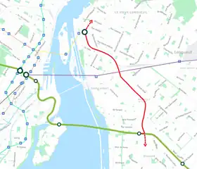 In partnership with the City of Longueuil and the Municipality of Brossard, the Quebec government announced an extension of the REM through the South Shore of Montreal. This branch has been referred to as "REM 2.0" and is planned to connect the existing REM line at Terminus Panama to the Montreal metro at Terminus Longueuil.[62] The REM 2.0 would follow the axis of Taschereau Boulevard for much of its length, superseding earlier proposals for an electric tramway, the "East–West Electric Line" (Lien électrique est–ouest or LÉEO),[63] to connect these transit hubs. The Quebec government suggested that this REM line could ultimately continue in either direction to the municipalities of Châteauguay and Boucherville respectively.[64]