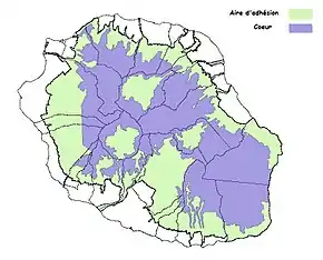 The core of Réunion National Park covers 1,053.84 km2 (406.89 sq mi) in the interior of the island, corresponding to 42% of its surface and extending over the land of 23 communes. This core area also includes some inhabited and cultivated land. Adjacent to the core is an area of voluntary commitment (aire d'adhésion, buffer zone) covering 876.96 km2 (338.60 sq mi) and touching all 24 communes on the island. Altogether, the park extends over more than 75% of the island.[4]: 12 The island of Réunion is volcanic in origin and sits over a hotspot.[5] Two volcanoes form its backbone: The Piton des Neiges, over 3,000 m (9,800 ft) high, and the still active Piton de la Fournaise.[6] Four major areas form the heart of the national park, listed as World Heritage site:[6]