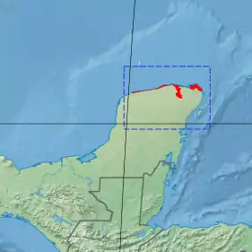 The ecoregion stretches across 300 km of the northeastern coast of the Yucatan Peninsul, from the coastal town of Chelem in the west to the coastal lagoons north of Cancun. The region also reaches inland for 50 km on flat land south of Playa las Coloradas. The distinctive character of the mangroves is partly due to the karst (limestone) topography and freshwater source.[4] The ecoregion is surrounded on the land side by the Yucatan dry forests ecoregion.
