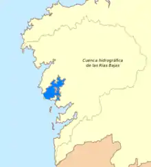 The Ría de Arousa is a ria, a saline estuary, that forms a firth situated on Galicia, Spain. It is one of the five Rías Baixas. The Ría de Arousa estuary is the largest of the estuaries of Galicia. It is part of the Rias Baixas and is located between the estuary of Muros and Noia to the north and the Pontevedra estuary to the south. The peninsulas of Barbanza, in the province of A Coruña, and O Salnés, in the province of Pontevedra, are those who define their coasts on the north and south, respectively. Ría de Muros and Noia (es, gl) is located in north.