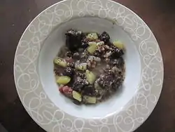 Rössypottu is a traditional Finnish dish which originates from the Oulu region yet is very much unknown in the southern parts of the country. Essentially a very simple dish, it is a stew made using potatoes (pottu, peruna), some pork and the main ingredient, so-called "rössy" i.e. blodpalt made of blood, beer, rye flour and some spices.