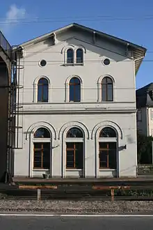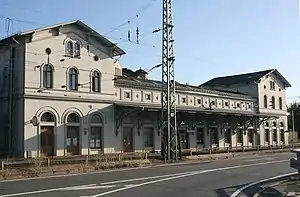 Rüdesheim (Rhein) station is in the town of Rüdesheim am Rhein in the German state of Hesse on the East Rhine Railway (German: Rechte Rheinstrecke). It is on the western edge of the town, separated from the Rhine only by federal highway B 42. The entrance building is a double storey stucco building in a neoclassical style. It is now one of the cultural monuments listed in the UNESCO World Heritage Site of the Upper Middle Rhine Valley. The station is classified by Deutsche Bahn as a category 5 station.[1]