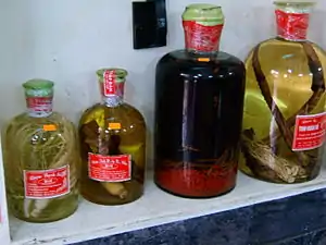 Rượu thuốc (lit. 'medicinal liquor') or rượu dân tộc (lit. 'traditional liquor') is a kind of Vietnamese distilled liquor (rượu) with herbs and medical animals, considered by traditional medicine as good for health. This drink is a mixture of alcohol mixed with herbs or animals which are used as drink and medicine in Vietnam. In Vietnam, rượu thuốc is widely believed to help drinkers improve their health and virility.[1]