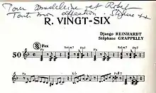 Django Reinhardt and Stéphane Grappelli continued to favor R-26 as an informal rehearsal space for the Quintette du Hot Club de France, often improvising with other members of the salon. In 1947, in honor of ten years spent at R-26 as guests of the Perrier family, Reinhardt and Grappelli composed the song "R. vingt-six", to be used as an anthem among the salon's members.[12]