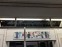 From late 2017 to late 2018, the interiors of the electronic sign boxes on cars 7691–7692 were retrofitted with LCD screens, replacing the MTA Arts for Transit cards usually located there. Several R160s were previously retrofitted with this feature. The screens were similar to the interior LED screens on the R143s, except that the R142As' screens had the capabilities to display multiple colors instead of only red, orange, and green.[21]
