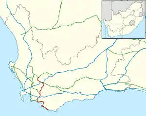 The R43 is a provincial route in the Western Cape province of South Africa which connects Ceres with Gansbaai via Worcester, Botrivier and Hermanus. It is co-signed with the N2 for nine kilometres near Botrivier.[1] [2]