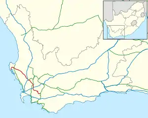The R45 is a provincial route in Western Cape, South Africa that connects Saldanha with Villiersdorp via Vredenburg, Malmesbury and Paarl. The route is mostly a two-lane wide-shouldered highway, however sections within Paarl and between Vredenburg and Saldanha are dual-carriageways. The R45 is co-signed with the N7 for a short segment north of Malmesbury.[1]