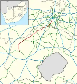 The R59 is a provincial route in South Africa that connects Hertzogville with Alberton (south-east of Johannesburg) via Bothaville, Parys and Vereeniging. The R59 is a freeway from the R57 Junction in Sasolburg until the Alberton N12 Reading Interchange, signposted as the Sybrand van Niekerk Freeway. [1]