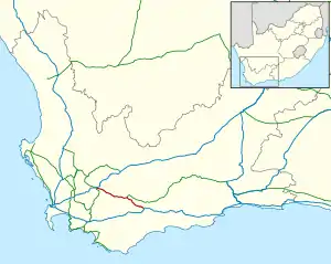 The R60 is a provincial route in Western Cape, South Africa that runs along the Breede River Valley, connecting Worcester with Swellendam via Robertson. It also provides a high-speed highway link between the N1 and the N2 national roads. [1]