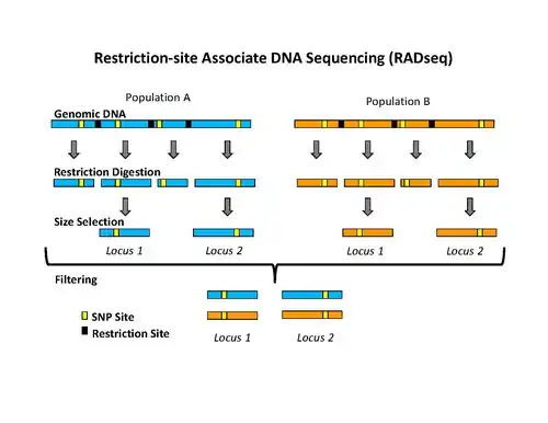 Restriction site associated DNA (RAD) markers are a type of genetic marker which are useful for association mapping, QTL-mapping, population genetics, ecological genetics and evolutionary genetics. The use of RAD markers for genetic mapping is often called RAD mapping. An important aspect of RAD markers and mapping is the process of isolating RAD tags, which are the DNA sequences that immediately flank each instance of a particular restriction site of a restriction enzyme throughout the genome.[1] Once RAD tags have been isolated, they can be used to identify and genotype DNA sequence polymorphisms mainly in form of single nucleotide polymorphisms (SNPs).[1] Polymorphisms that are identified and genotyped by isolating and analyzing RAD tags are referred to as RAD markers. Although genotyping by sequencing presents an approach similar to the RAD-seq method, they differ in some substantial ways.[2][3][4]