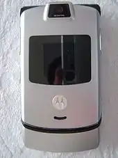 The Motorola Razr (styled RAZR, pronounced /ˈreɪzər/ like "razor"; codenamed Siliqua[1]) is a discontinued series of flip phones that is part of the 4LTR line and was manufactured by Motorola Mobility (previously Motorola) until 2007, in favor of the Motorola Razr2. The V3 was the first phone shown in the series and was introduced in December 2003[2] and released in the market in the third quarter of 2004.[3] The V3 model was followed soon thereafter by the improved V3i, including a collaboration with Apple Inc. for iTunes to be built-in. It was launched in 2006.