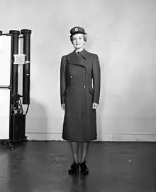 The uniform changed somewhat in 1943. The new uniform, which was meant to be primarily worn off the stations, added a pleat to the greatcoat and the skirt was changed to a six-gore pattern. The pleated tunic pockets were replaced with flat patch pockets below and false pockets above, and the belt became detachable. A blue leatherette shoulder bag was added. The cap was replaced with one with a kepi-style with a deep visor and higher stiffened front.