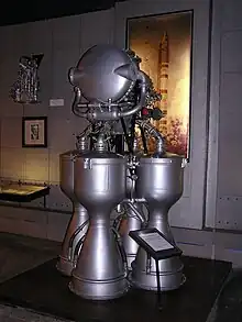 The RD-214 (GRAU Index 8D59) was a liquid rocket engine, burning AK-27I (a mixture of 73% nitric acid and 27% N2O4 + iodine passivant and TM-185 (a kerosene and gasoline mix) in the gas generator cycle.[2][3] As was the case with many V-2 influenced engines, the single turbine was driven by steam generated by catalytic decomposition of H2O2. It also had four combustion chambers and vector control was achieved by refractory vanes protruding into the nozzle's exhaust.[4]