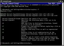 The replace command first appeared in MS-DOS 3.2[2] and has been included in most versions of MS-DOS and compatibles such as FreeDOS[3] and PTS-DOS.[4] DR DOS 6.0 includes an implementation of the replace command.[5] The FreeDOS version was developed by Rene Ableidinger and is licensed under the GPL.[6] It is also included as a console command in IBM OS/2,[7] Microsoft Windows,[8] and ReactOS. The ReactOS version was developed by Samuel Erdtman and is licensed under the GPL.[9]