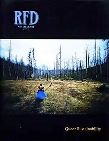 The publication's formal name is simply RFD, although it has alternatively been billed as "a country journal by gay men,"[4] "for country faggots everywhere,"[5] and more recently identified as "a reader-written quarterly celebrating queer diversity". The title originally evoked the well-known abbreviation for Rural Free Delivery, the residential mail service provided by the USPS beginning in the early 1900s, reflecting the "country living" aesthetic of the magazine. Later, as the magazine came to be associated with the counterculture Radical Faeries movement, the name became widely presumed as an abbreviation of Radical Faerie Digest (itself an ironic take on the mainstream Reader's Digest). In reality the publishers have adopted the practice of assigning a new expansion of the initials to each issue, such as Really Feeling Divine (issue 3, Spring 1975), Rejoicing in Flamboyant Diversity (issue 50, Spring 1987), or Resist Fascist Demagogues (issue 80, Winter 1994).[6]
