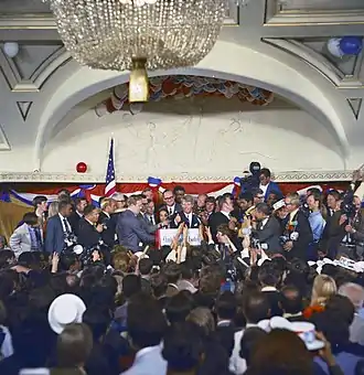 His tenure is known for advocating for the civil rights movement, the fight against organized crime and the Mafia, and involvement in U.S. foreign policy related to Cuba.[6] He authored his account of the Cuban Missile Crisis in a book titled Thirteen Days. As attorney general, he authorized the Federal Bureau of Investigation (FBI) to wiretap Martin Luther King Jr. and the Southern Christian Leadership Conference on a limited basis.[7] After his brother's assassination, he remained in office during the presidency of Lyndon B. Johnson for several months. He left to run for the United States Senate from New York in 1964 and defeated Republican incumbent Kenneth Keating, overcoming criticism that he was a "carpetbagger" from Massachusetts.[8][9] In office, Kennedy opposed U.S. involvement in the Vietnam War and raised awareness of poverty by sponsoring legislation designed to lure private business to blighted communities (i.e., Bedford Stuyvesant Restoration project). He was an advocate for issues related to human rights and social justice by traveling abroad to eastern Europe, Latin America, and South Africa, and formed working relationships with Martin Luther King Jr., Cesar Chavez, and Walter Reuther.