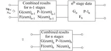 Consider the nth stage in a chain of RF devices. The cumulative gain, noise figure, 1 dB compression point[14][3]: 119 and output thermal noise power for the preceding (n-1) devices are given by Gcumn - 1, Fcumn - 1, Pcumn - 1 and Ncumn - 1, respectively. We wish to determine the new cumulative figures, when the nth stage is included, i.e. the values of Gcumn, Fcumn, Pcumn and Ncumn, given that the nth stage has values of Gn, Fn, P1n for its gain, noise figure and 1 dB compression point, respectively.