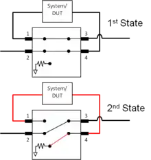 An RF switch or microwave switch is a device to route high frequency signals through transmission paths. RF (radio frequency) and microwave switches are used extensively in microwave test systems for signal routing between instruments and devices under test (DUT). Incorporating a switch into a switch matrix system enables you to route signals from multiple instruments to single or multiple DUTs. This allows multiple tests to be performed with the same setup, eliminating the need for frequent connects and disconnects. The entire testing process can be automated, increasing the throughput in high-volume production environments.