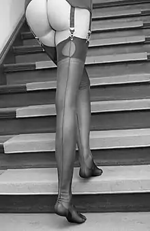 Fully fashioned stockings are usually knitted from sheer nylon yarn. To support the attachment of suspenders, they have a darker section of double fabric at the top, called the welt. This is followed by a lighter transitional section called the shadow welt. The keyhole is visible in the middle of the seam at the back of the welt.[1] The back seam is an integral part of the stocking and not sewn on afterwards.[2]