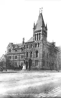 Building 1 was constructed as the Working Men's College (antecedent of the present-day RMIT).[22][23] Located on the corner of Bowen Street and La Trobe Street, it was RMIT's first building. The three story Gothic Revival building is in the Scottish Baronial-style with Second Empire-inspired roof detailing.[24][25] Its design was a result of an 1883 competition won by architects Leonard Terry, Percy Oakden and Nahum Barnet.[25][26] It is constructed of brick and faced with a finely-worked Barrabool sandstone and Waurn Ponds stone dressings.[25][26]