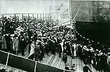 In September 1909, Mauretania captured the Blue Riband for the fastest westbound crossing—a record that was to stand for more than two decades.[1] In December 1911, as in New York City in December 1910, Mauretania broke loose from her moorings while in the River Mersey and sustained damage that caused the cancellation of her special speedy Christmas voyage to New York. In a quick change of events Cunard rescheduled Mauretania's voyage for Lusitania, which had just returned from New York, under the command of Captain James Charles. Lusitania completed Christmas crossings for Mauretania,[28] carrying travellers back to New York. Mauretania was on a westbound voyage from Liverpool to New York, beginning 10 April 1912, and was docked at Queenstown, Ireland, at the time of the RMS Titanic disaster. Mauretania was transporting Titanic's cargo manifest carried by registered mail. Traveling on Mauretania at the time was the chairman of Cunard, A. A. Booth, who organised a vigil for the Titanic victims.[29] In the spring of 1913 westbound transatlantic passage aboard Mauretania cost roughly $17 for third class passengers, as shown in the original ticket at right.