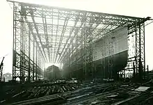 Mauretania and Lusitania were both designed by Cunard naval architect Leonard Peskett, with Swan Hunter and John Brown working from plans for an ocean greyhound with a stipulated service speed of twenty-four knots in moderate weather, as per the terms of her mail subsidy contract. Peskett's original configuration for the ships in 1902 was a three-funnel design, when reciprocating engines were destined to be the powerplant. A giant model of the ships appeared in Shipbuilder's magazine in this configuration. Cunard decided to change power plants to Parson's new turbine technology, and the ship's design was again modified when Peskett added a fourth funnel to the ship's profile. Construction of the vessel finally began with the laying of the keel in August 1904.[8] By tradition, the hull was painted in a light grey colour for photographic purposes during her launch; a common practice of the day for the first ship in a new class, as it made the lines of the ship clearer in the black-and-white photographs. Her hull was painted black after her maiden voyage.[9]