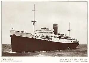 RMS Nova Scotia was a 6,796 GRT UK transatlantic ocean liner and Royal Mail Ship. In World War II she was requisitioned as a troopship. In 1942 a German submarine sank her in the Indian Ocean with the loss of 858 of the 1,052 people aboard.[4]