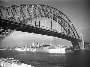 ![]() RMS Strathaird, in her original form with three funnels, passing under Sydney Harbour Bridge | |
