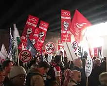 Politically the RMT is affiliated with the left wing political party, the Trade Unionist and Socialist Coalition (TUSC),[23] which it co-founded and encourages members to participate in.[24] The RMT is also affiliated to the Labour Representation Committee,[25] a pressure group which aims to promote traditional socialist principles within the Labour Party.