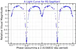 RS Sagittarii is an eclipsing binary star system in the southern constellation of Sagittarius, abbreviated RS Sgr. It is a double-lined spectroscopic binary with an orbital period of 2.416 days,[8] indicating that the components are too close to each other to be individually resolved. The system has a combined apparent visual magnitude of 6.01, which is bright enough to be faintly visible to the naked eye. During the primary eclipse the brightness drops to magnitude 6.97, while the secondary eclipse is of magnitude 6.28.[3] The distance to this system is approximately 1,420 light years based on parallax measurements.[2]