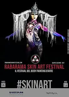 The Rabarama Skin Art Festival (abbreviated: RSAF) is an international festival dedicated to the promotion of artistic body painting, in the form known as "Skin Art".[1] Begun in 2014, the festival is held every year in Italy from May to October, with selections in various Italian cities. The final event was held in Merano (BZ) in 2014, 2015, 2016 and 2017. The festival is supported by a brand leader in professional cosmetics,[2] by the artist Rabarama,[3] and by various Italian municipalities.[4] The international media partner is the body painting magazine "Skin MarkZ" (USA).