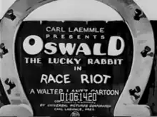 Race Riot is a 1929 animated short film which is presented by Carl Laemmle and was produced by Walter Lantz.[1] who would go on to produce and create the cartoon character Woody Woodpecker with his wife,[2] Gracie Lantz.[3] The film, which both its story and animation was composed by Walter Lantz, 'Bill' Nolan and Tom Palmer,[1] features Oswald the Lucky Rabbit,[1] as he attempts to win a horse race with his horse.[1] The horse's coughs were done by Walter Lantz.