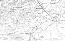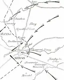 On 1 October, the French at Arras were pushed back from Guémappe, Wancourt and Monchy-le-Preux, until the arrival of X Corps.[50] By 1 October, two more French corps, three infantry and two cavalry divisions had been sent northwards to Amiens, Arras, Lens and Lille, which increased the Second Army to eight corps, along a front of 62 mi (100 km). Joffre ordered Castelnau to operate defensively, while Maud'huy and the subdivision d'armée advanced on Arras. On 28 September, Falkenhayn had ordered the 6th Army to conduct an offensive by the IV, Guard and I Bavarian corps near Arras and more offensives further north.[51][lower-alpha 3] Rupprecht intended to halt the French west of Arras and envelop them around the north side of the city.[51] On 1 October, the French attacked to the south-east, expecting only a cavalry screen.[53]
