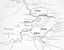 Antwerp was invested to the south and east by German forces after 20 August, while the main German armies chased the French and British over the border southwards to the Marne. Belgian forces in Antwerp tried to assist the French and British with sorties on 24–26 August, 9–13 September and 26–27 September. On 28 September, German heavy and super-heavy artillery began to bombard Belgian fortifications around Antwerp.[34] On 1 October, the Germans attacked forts Sint-Katelijne-Waver and Walem and the Bosbeek and Dorpveld redoubts, held by the 5th Reserve and Marine divisions. By 11:00 am, Fort Walem was severely damaged and Fort Lier was hit by 16 in (410 mm) shells but Fort Koningshooikt, the Tallabert and Bosbeek redoubts were mostly intact; the intervening ground between Fort Sint-Katelijne-Waver and Dorpveld redoubt had been captured. Despite reinforcement by the Royal Naval Division from 2 October, the Germans penetrated the outer ring of forts. When the German advance began to compress a corridor from the west of the city along the Dutch border to the coast, the Belgian field army withdrew from Antwerp westwards towards the coast. On 9 October, the remaining garrison surrendered and the Germans occupied the city. Some British and Belgian troops escaped to the Netherlands, where they were interned for the duration of the war. The Belgian withdrawal was protected by a French Marine brigade, Belgian cavalry and the British 7th Division around Ghent. On 15 October, the Belgian army occupied a defensive line along the Yser river in west Flanders, from Diksmuide to the coast.[35]