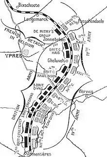 The German 6th Army took Lille before a British force could secure the town and the 4th Army attacked the exposed British flank at Ypres. On 9 October, the German XIV Corps arrived opposite the French and the German 1st and 2nd Cavalry corps tried a flanking move between La Bassée and Armentières but the French cavalry stopped the Germans north of La Bassée Canal. The German 4th Cavalry Corps passed through Ypres on 7 October and was forced back to Bailleul by French Territorial troops.[56] From 8–9 October the British II Corps arrived by rail at Abbeville and advanced on Béthune. By the end of 11 October, II Corps held a line from Béthune to Hinges and Chocques, with flanking units on the right, 2.2 mi (3.5 km) south of Béthune and on the left 2.8 mi (4.5 km) to the west.[57] On 12 October, II Corps attacked to reach Givenchy and Pont du Hem, 3.7 mi (6 km) north of La Bassée Canal. The German I and II Cavalry corps and attached Jäger tried to delay the advance but the British repulsed a counter-attack near Givenchy.[58]