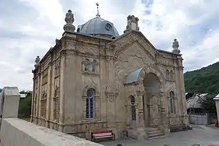 The synagogue in Oni is the third largest in Georgia, and was opened in 1895 after a 4-year construction period. The synagogue is inspired by the Great Synagogue in Warsaw (Poland).[14][13] The rabbi of Oni saw this synagogue during a study in Warsaw and wanted a similar synagogue in Oni. He had a Polish design made in an eclectic style that also has references to synagogues in Tykocin and Krakow. It was built by Greek workers using limestone and rock. By 2021 the Jewish community in Oni is only 12 people small and it is difficult to keep the synagogue open. Services are only held if the attendance is at least 10.