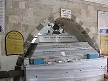 The tomb of Rachel is located in Tiberias, a short distance from the tomb of Rabbi Meir Ba'al HaNes, one of Akiva's disciples.[32][33] Akiva's tomb is located in the same city in a different location.[34] The rectangular-shaped tomb was in a state of neglect for many years until Rabbi Refael Cohen, a Tiberas kashrut inspector, "rediscovered" it in 1993 in a disused Muslim cemetery and convinced a London donor to refurbish it.[32][35] Muslim religious leaders claimed the site was originally a shrine to Lady Sakina (d. 745 in Medina), a relative of Muhammad. However, the placement of twelve windows in the ohel (structure over the tomb) – a typically Jewish architectural feature symbolizing the twelve tribes – indicates it was originally built by Jews and later used by Muslims. The Muslim authorities brought up the appropriation of the tomb in the Knesset, but did not pursue a court case, so "the change of identity is now a fact".[32][35] As part of the refurbishment, separate spaces were created around Rachel's grave for men and women who come to pray and light candles.[21][32] Bottled water from "Rachel's well", amulets, and souvenirs are sold at the site.[36][33]