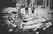 During the German occupation of Poland (World War II), several Polish inhabitants of Raciąż, including two Catholic priests were among over 50 Poles murdered by the Germans in Rudzki Most on October 24, 1939 (see also Nazi crimes against the Polish nation).[4] Many Polish farmers from Raciąż were murdered in further massacres in Rudzki Most.[5] In 1940, 1942 and 1943, the occupiers carried out expulsions of Poles, whose houses were then handed over to German colonists as part of the Lebensraum policy.[6] Expelled Poles were often either imprisoned in the Potulice concentration camp, deported to forced labour in Germany or enslaved as forced labour of new German colonists at the site.[6]
