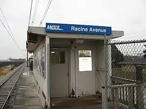 Racine Avenue is a commuter rail station along the Blue Island Branch of the Metra Electric line in the West Pullman neighborhood of Chicago, Illinois. The station is officially located at Racine Avenue, South of 120th Street, and is 17.0 miles (27.4 km) away from the northern terminus at Millennium Station.[2] In Metra's zone-based fare system, Racine Avenue is in zone C. As of 2018, Racine Avenue is the 221st busiest of Metra's 236 non-downtown stations, with an average of 28 weekday boardings.[1]